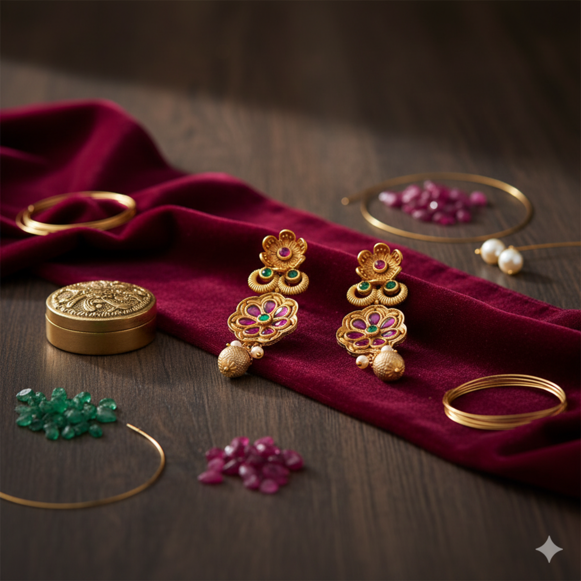 Embrace timeless elegance with these antique gold floral earrings, beautifully adorned with vibrant ruby and emerald gemstones. The intricate gold detailing paired with delicate pearl drops enhances their classic charm, making them an ideal accessory for special occasions and festive moments. Crafted with care, these earrings celebrate traditional artistry and promise to be a cherished addition to your collection. Let them elevate your style with grace and sophistication.